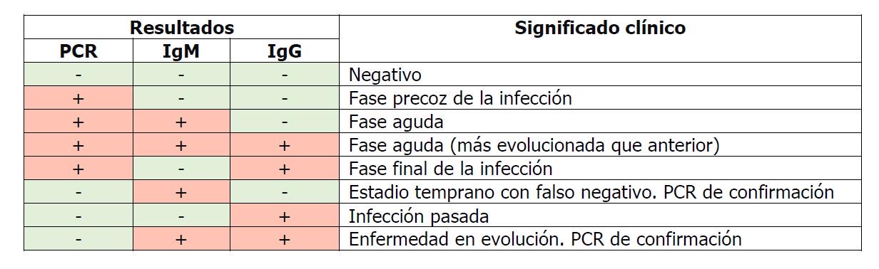 El test de RT-PCR nos indica la presencia del virus, quién está infectado en ese momento. Los test de detección de anticuerpos nos indican quién estuvo infectado y quizá está inmunizado, al menos durante un tiempo, contra el coronavirus. Según esto, y con todas las reservas según la sensibilidad y especificidad de cada test, si combinamos resultados de RT-PCR, con detección de anticuerpos (IgM e IgG) se podría plantear lo siguiente:
